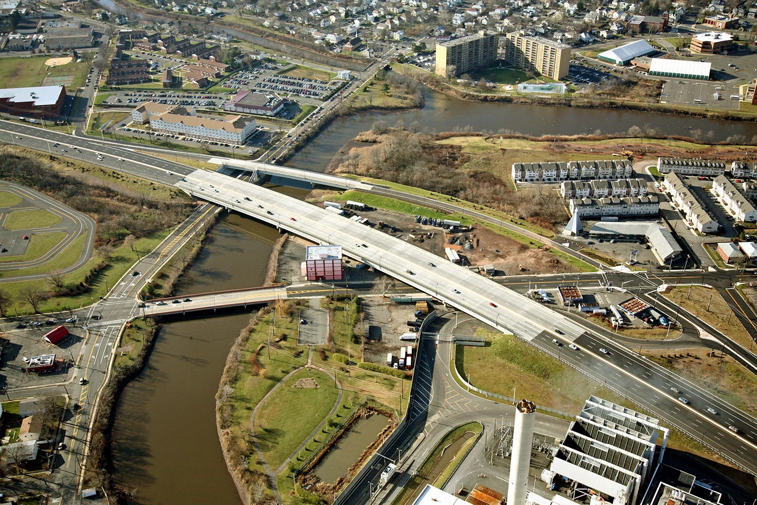 Union Paving constructed a new 1,000-foot-long bridge and related roadways to realign Rt. 1&9 over local roads and the Rahway River. The work included nine piers, two of which were located in the river. To build the two footings in the river, we installed two cofferdams approximately 40’ x 100’ and dewatered with pumps into a sediment/retention basin.